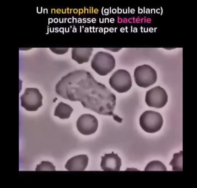 - Un neutrophile (globule blanc) pourchasse une bactérie jusqu’à l’attraper et la tuer.
