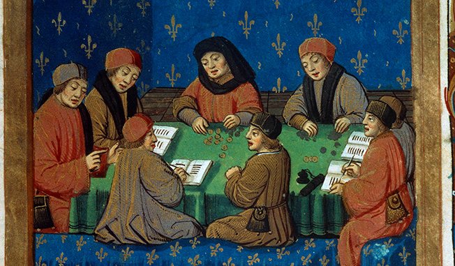 JLJ4568230 The counters of the Royal Tresor Miniature taken from a milking on silver, 14th century (miniature) by Unknown Artist, (14th century); Bibliotheque Nationale, Paris, France; (add.info.: The counters of the Royal Tresor Miniature taken from a milking on silver (probably De Moneta) by Nicolas Oresme (1320-1382), 14th century. B.N. Paris); Photo © Photo Josse.