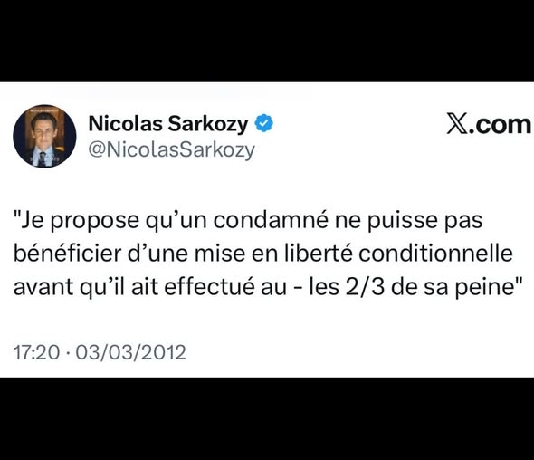 On March 3, 2012, former President of the Republic Nicolas Sarkozy proposed via the X platform that a prisoner should not be eligible for parole until two-thirds of their sentence had been served.